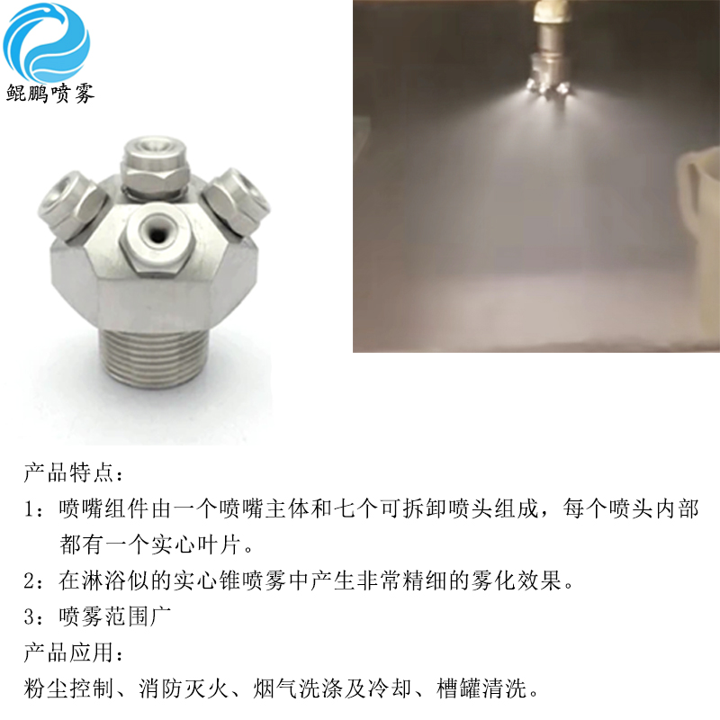 產(chǎn)品特點(diǎn): 1:噴嘴組件由一個(gè)噴嘴主體和七個(gè)可拆卸噴頭組成,每個(gè)噴頭內(nèi)部 都有一個(gè)實(shí)心葉片。 2:在淋浴似的實(shí)心錐噴霧中產(chǎn)生非常精細(xì)的霧化效果。 3:噴霧范圍廣 產(chǎn)品應(yīng)用: 粉塵控制、消防滅火、煙氣洗滌及冷卻、槽罐清洗。