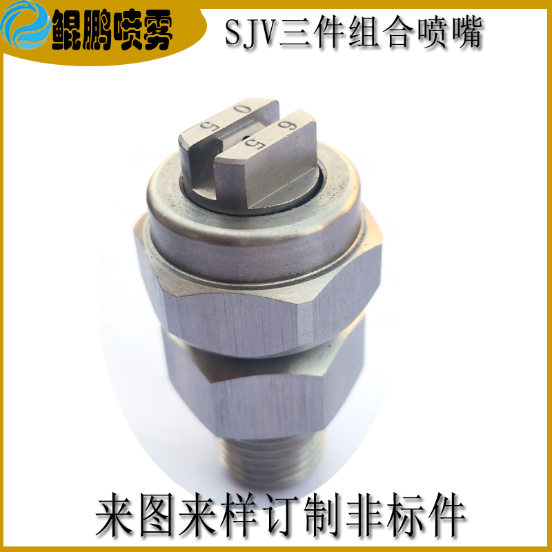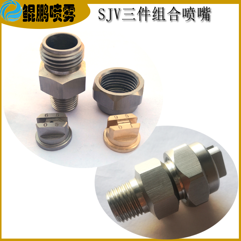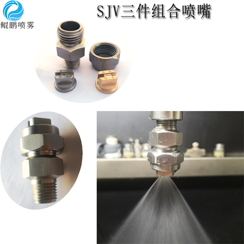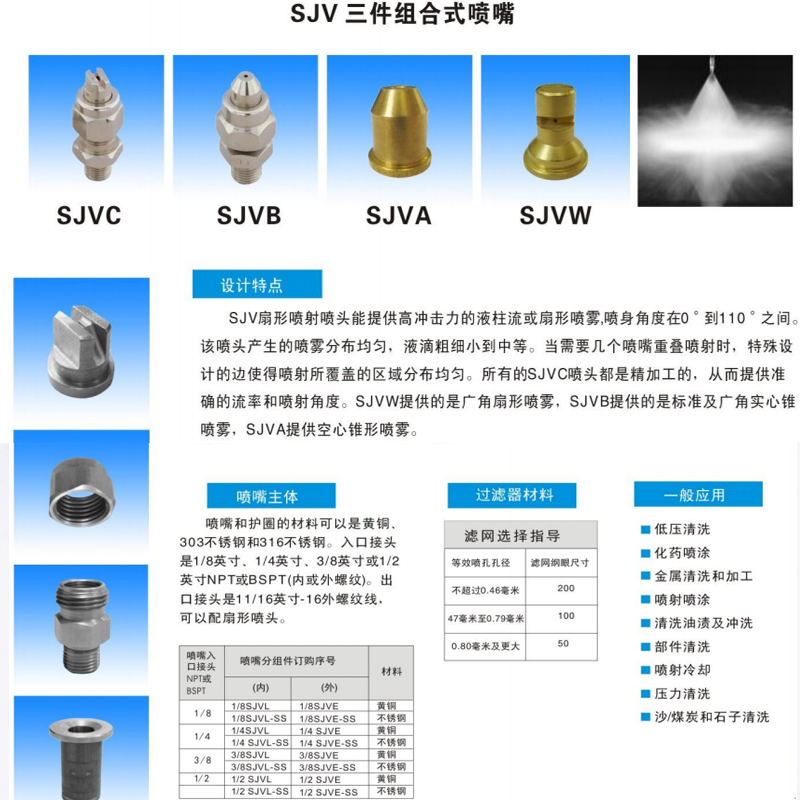 SJV三件組合式噴嘴 SJV扇形噴射噴頭能提供高沖擊力的注流或扇形噴霧,噴射角度在0-100之間,該噴頭產(chǎn)生的噴霧分均勻,液滴 由細小到中等,當需要幾個噴嘴重疊噴射時,特殊的設(shè)計邊使得噴