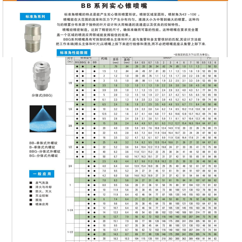 BB系列噴嘴: 1、使用時(shí)產(chǎn)生實(shí)心錐形噴霧形狀,噴霧區(qū)域成圓形,噴霧角度為43-120度。 2、能在大范圍流量和壓力下產(chǎn)生分布均勻、液滴大小為中等到偏大的噴霧,葉片設(shè)計(jì)是其設(shè)計(jì)機(jī)理,并大